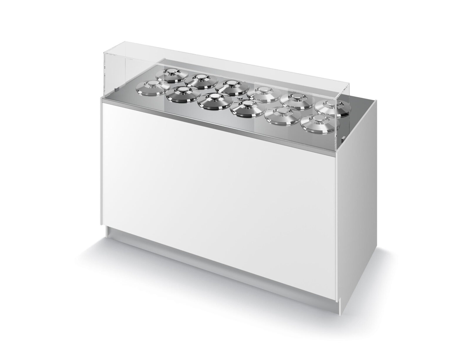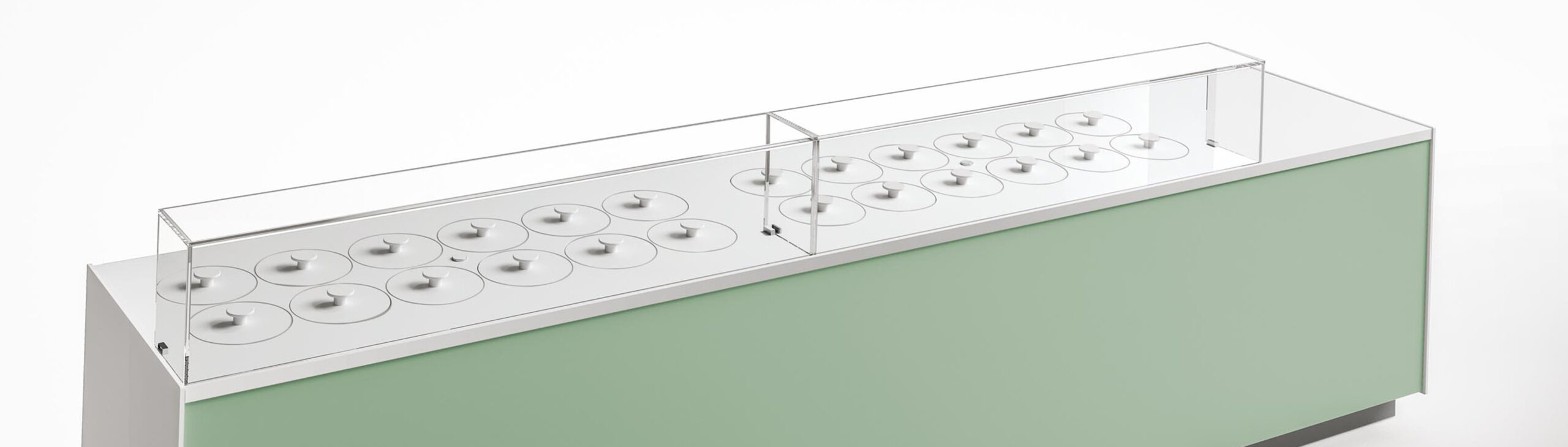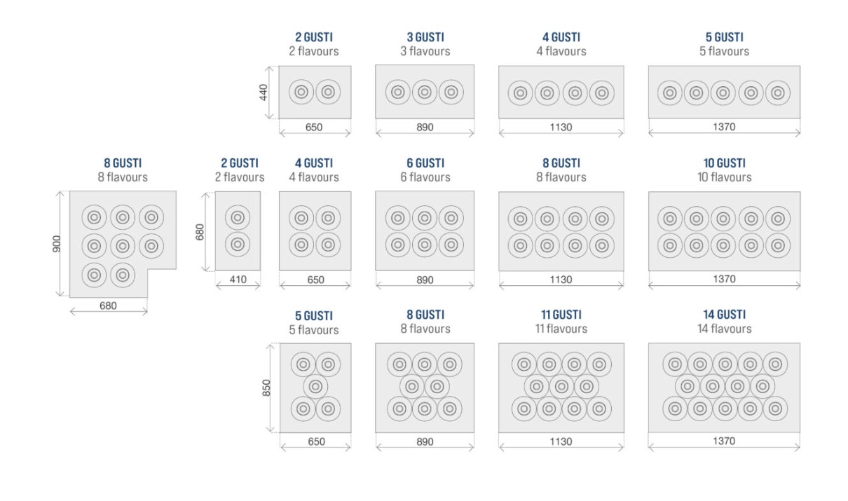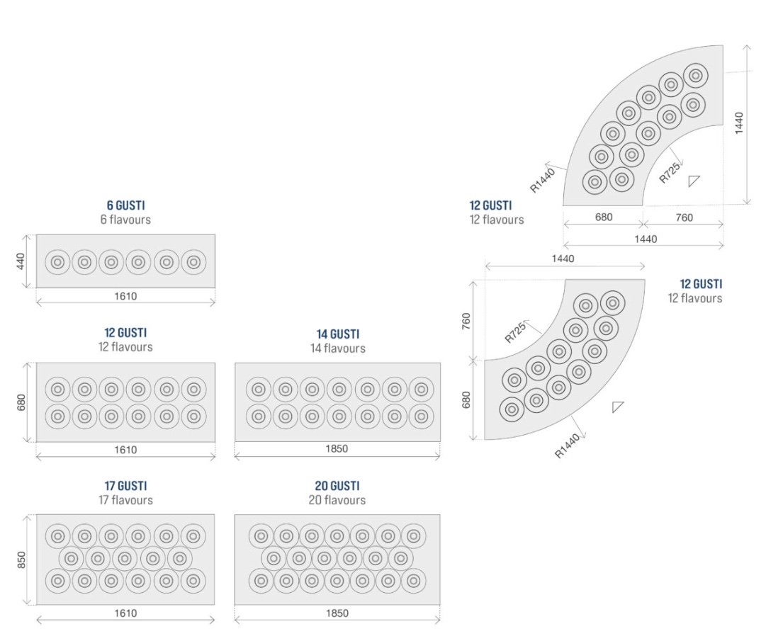 La gamme est disponible en plusieurs configurations : 1 à 3 rangées, de 2 à 20 parfums, avec carapines de Ø20 cm ou Ø26 cm. Les modules droits et d’angle permettent une multiplexation sur mesure, pour créer des comptoirs adaptés à chaque point de vente. L’évidement frontal réduit la fatigue de l’opérateur, tandis que les portes d’accès facilitent l’entretien et le nettoyage.