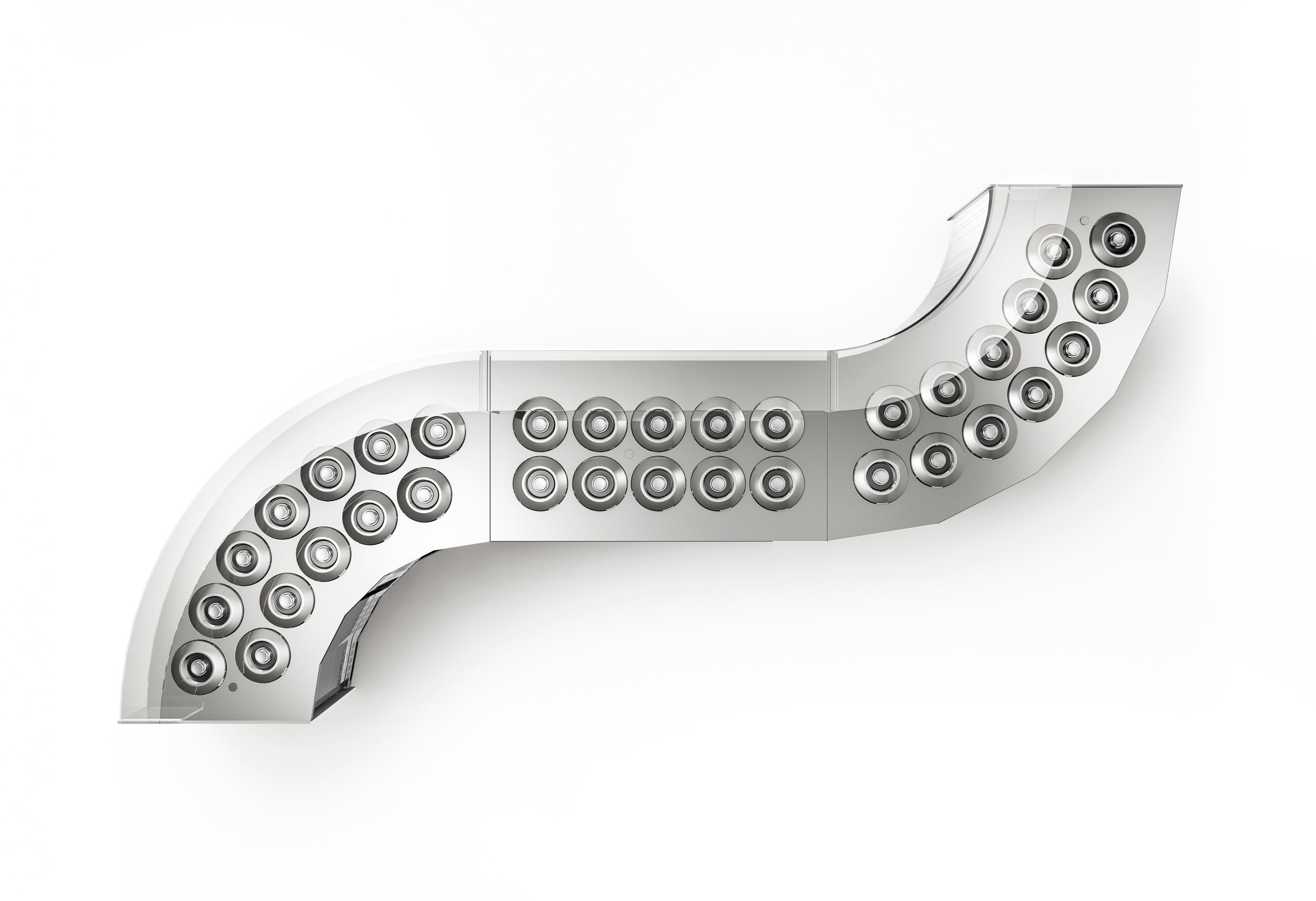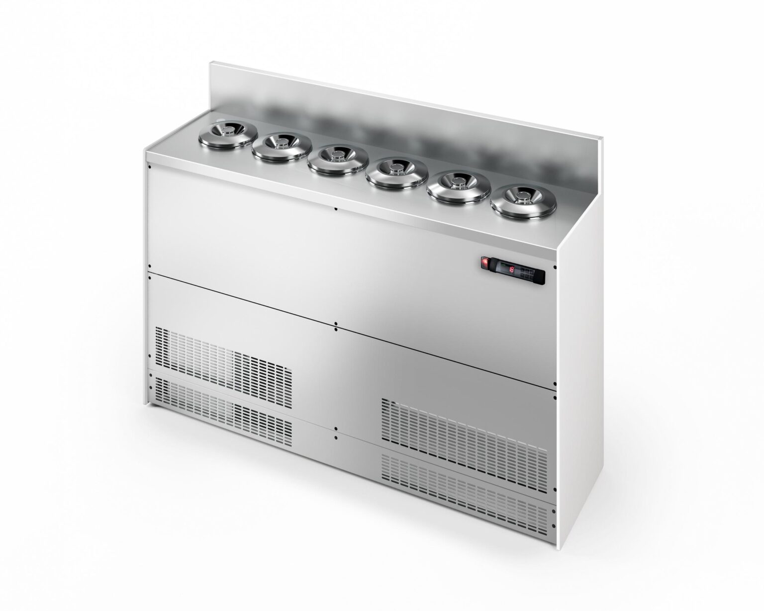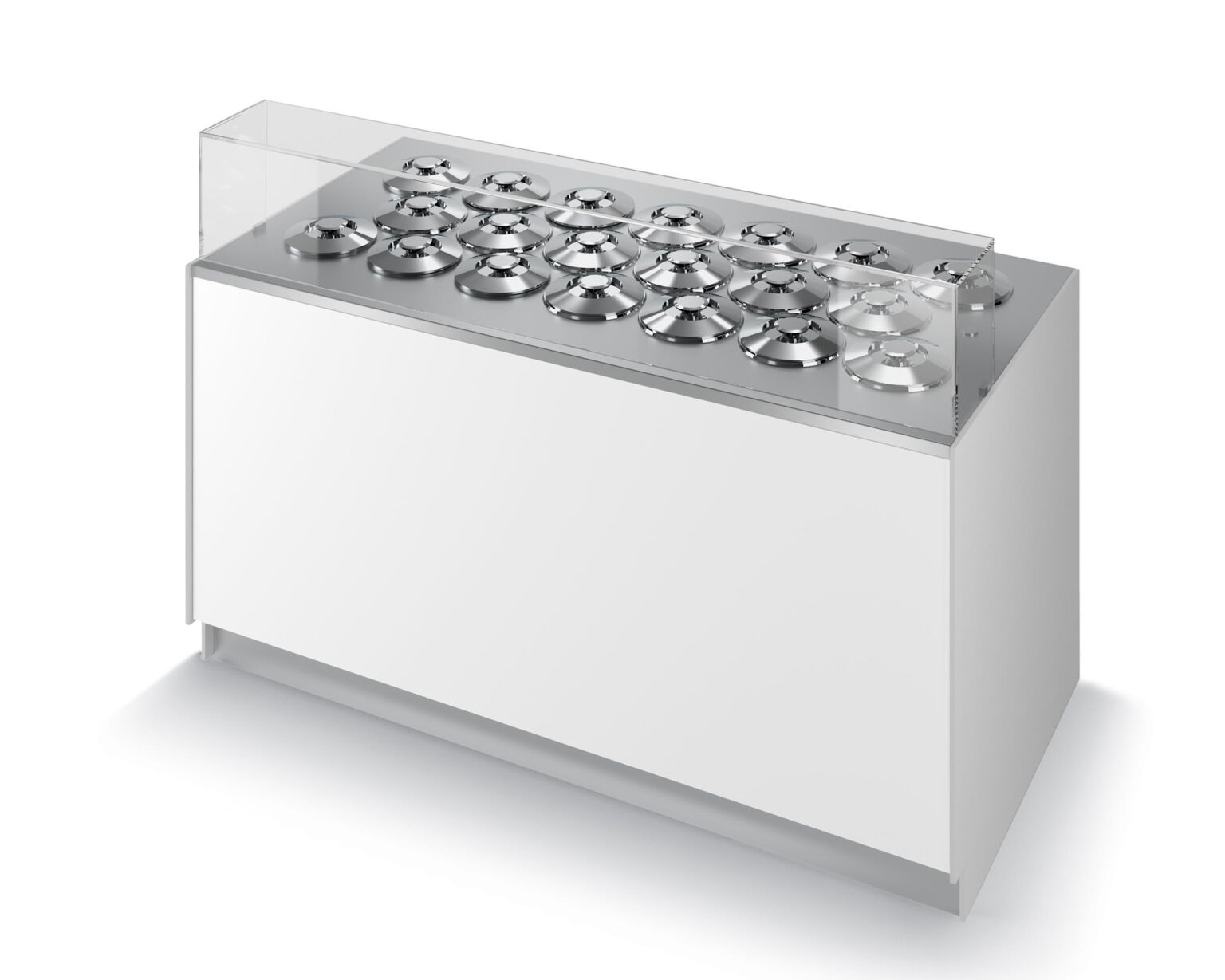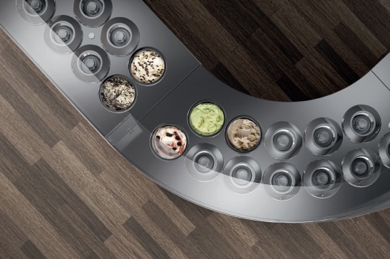 La gamme est disponible en plusieurs configurations : 1 à 3 rangées, de 2 à 20 parfums, avec carapines de Ø20 cm ou Ø26 cm. Les modules droits et d’angle permettent une multiplexation sur mesure, pour créer des comptoirs adaptés à chaque point de vente. L’évidement frontal réduit la fatigue de l’opérateur, tandis que les portes d’accès facilitent l’entretien et le nettoyage.