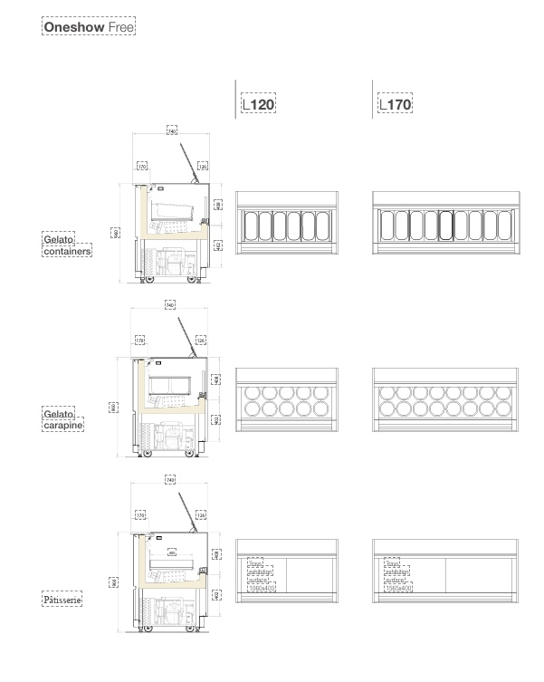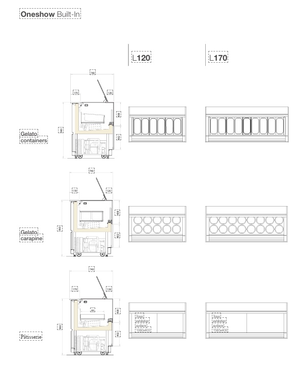 Configurations possibles : • Bacs (360 × 165 × 120 mm) : 6 (L120) / 9 (L170) • Bacs (360 × 250 × 80 mm) : 4 (L120) / 6 (L170) • Carapines ⌀154 × 160 mm : 10 (L120) / 16 (L170) • Bacs à sticks : 4 (L120) / 6 (L170) • Portions individuelles : 4 (L120) / 6 (L170) • Surface plateaux : 1060 × 400 (L120) / 1565 × 400 (L170) |