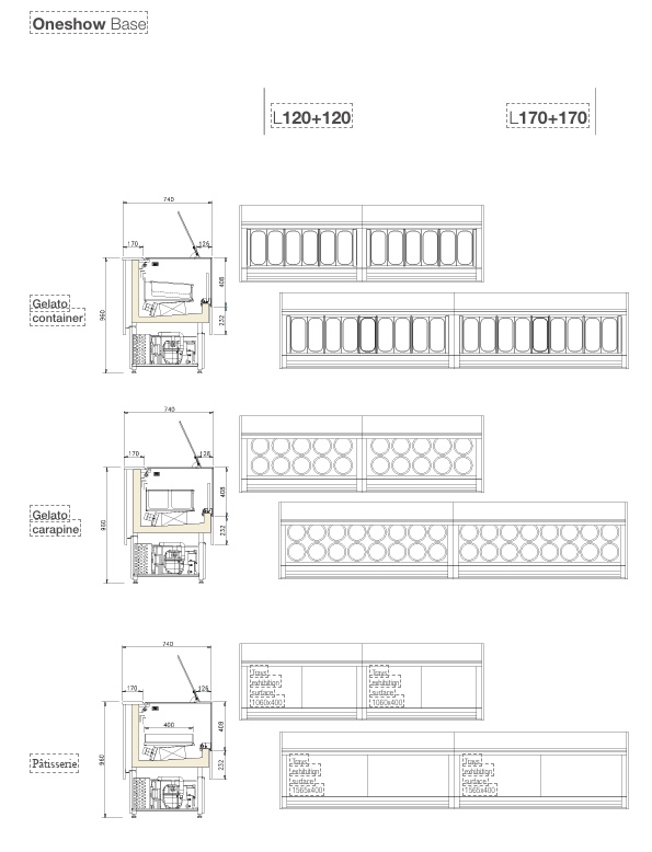 Base | 120+120 | 2360 × 740 × 960 | 545 L / 138 L | Classe 4 / Classe 3 | Glace : −20/+2 °C Pâtisserie : +1/+10 °C Chocolat : +14/+16 °C |