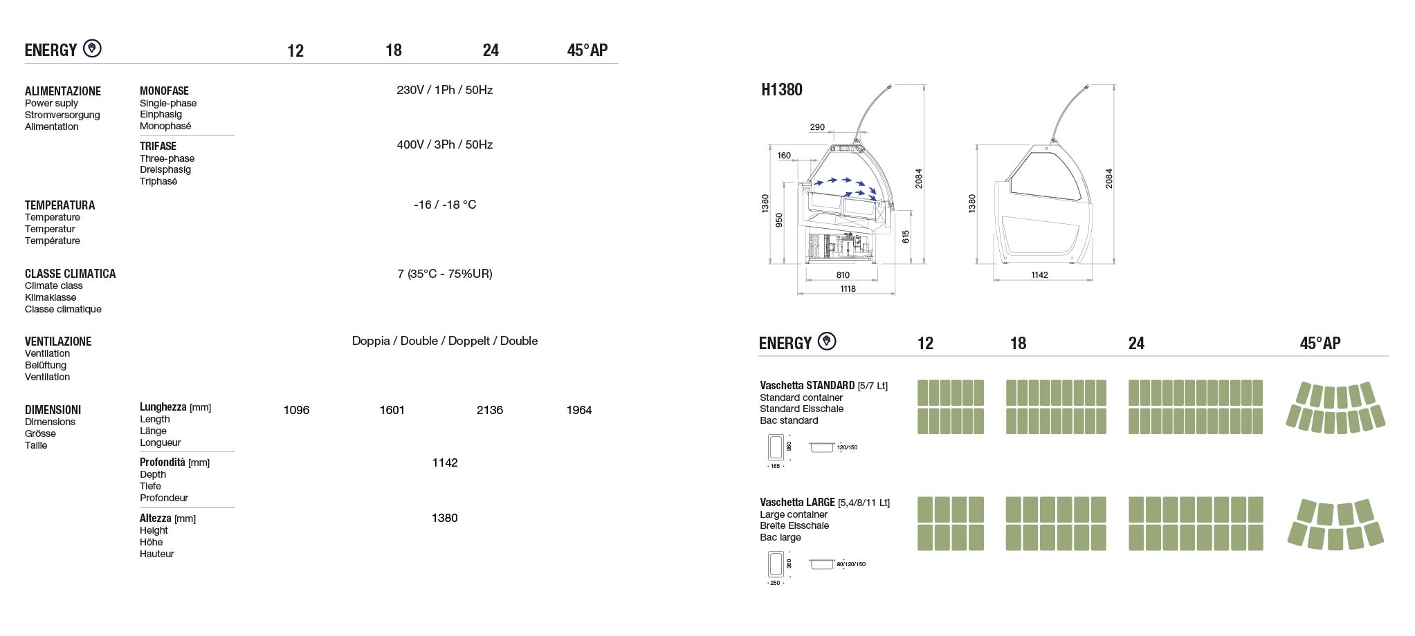 Glaces | 1096 • 1601 • 2136 • 1964 | 1380 | 1142 | 245 – 400 | 12 • 18 • 24 bacs (5 L) | −16 / −18 °C | 7 (35 °C / 75 % HR) | R404A ou R290 | 230V/1Ph/50Hz ou 400V/3Ph/50Hz | 2,5 – 5,1 kW | Cycle inversé |