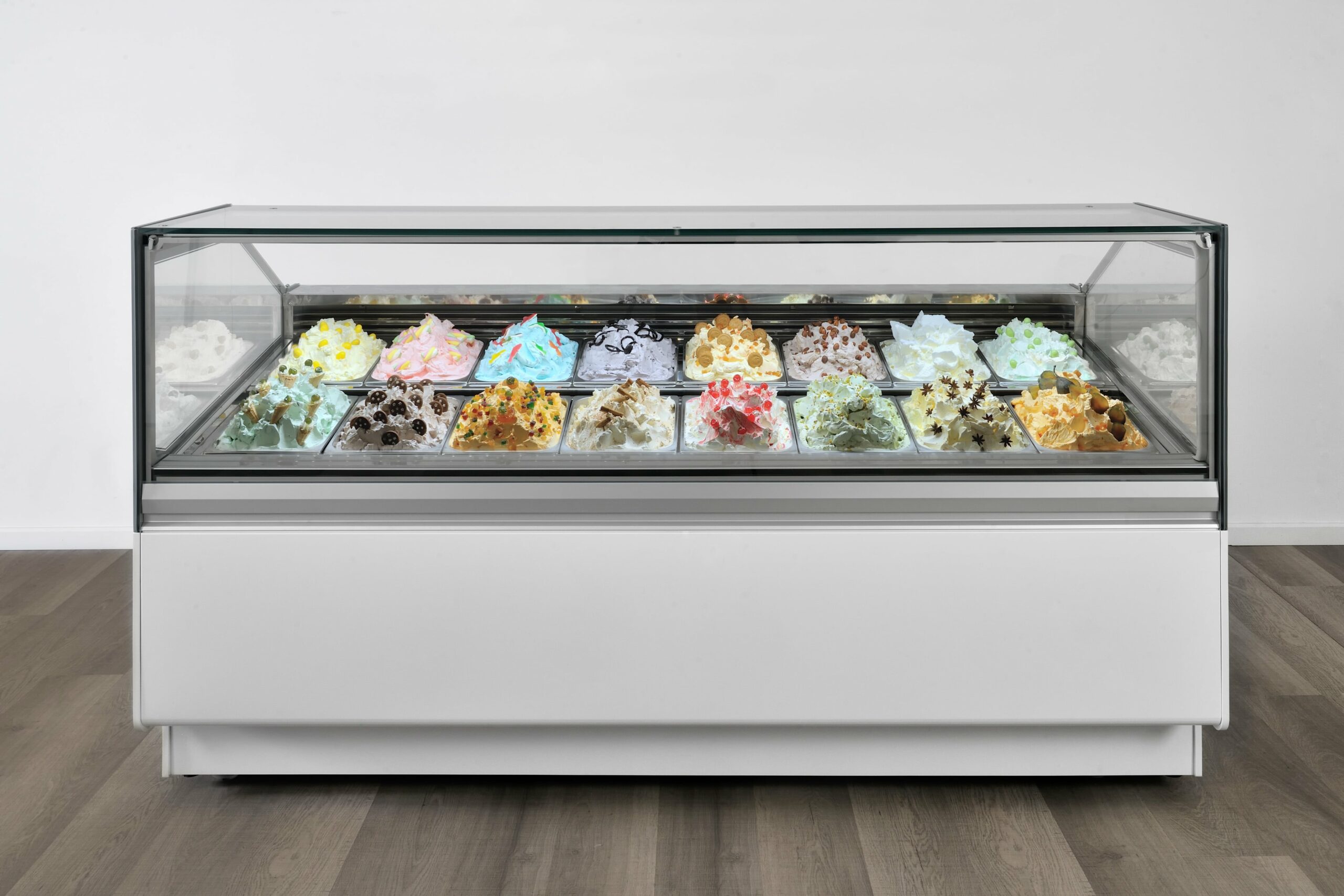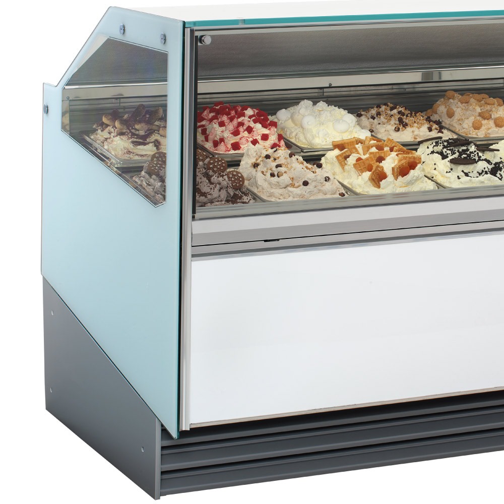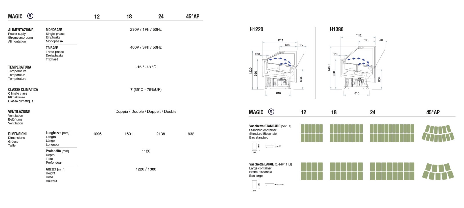 La vitrine MAGIC incarne le haut de gamme des vitrines réfrigérées pour glaciers, pâtissiers et chocolatiers. Avec son design moderne à vitrage intégral, elle offre une visibilité totale sur vos produits et valorise vos créations artisanales avec élégance. Disponible en plusieurs hauteurs (1220 ou 1380 mm) et en versions Glaces, Pâtisserie, Chocolaterie, Chaud sec ou Bain-marie, la MAGIC combine polyvalence et performance. Grâce à sa réfrigération ventilée double flux, ses vasques inox standard ou larges et sa version canalisable avec angles 45°, elle s’adapte parfaitement aux espaces de vente haut de gamme comme aux projets sur mesure.