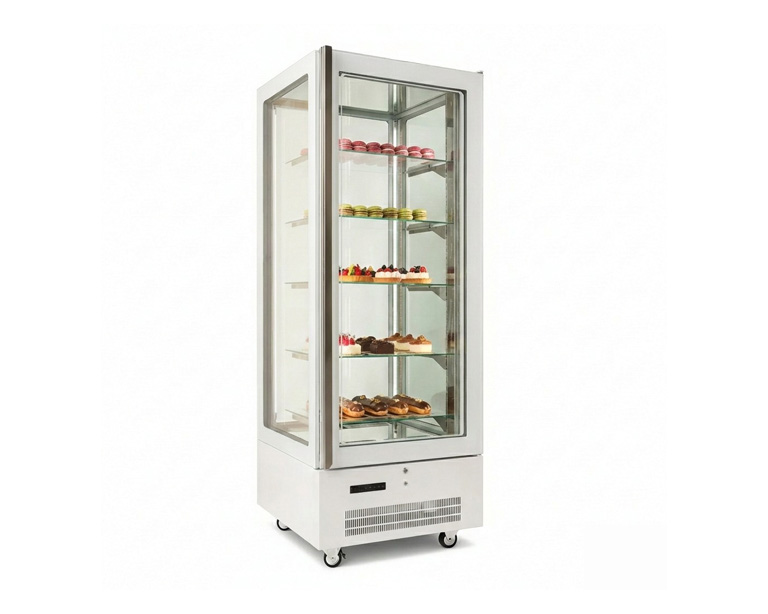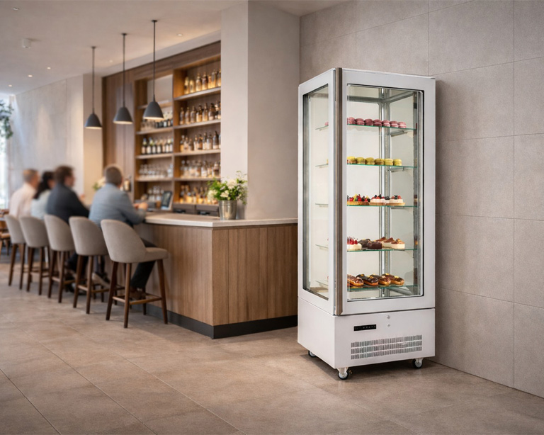 La vitrine réfrigérée Grace offre une conservation optimale grâce à son froid ventiléassurant une température homogène. Sa porte triple vitrage à faible émissivité réduit les pertes thermiques et la condensation, tandis que l’éclairage LED réglable met en valeur pâtisseries, chocolats et boissons.